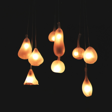 灯しても、灯さなくても、 辺りの空気を和ませる可憐な照明器具である。 それぞれの領域で、フォルムや技の洗練・密度の結集を競ってきた 従来のクラフトの傾向とは異なり、 フリーハンドなフォルムからは、モノをつくる喜びの原点が生き生きと伝わり、 時代の気分を写る軽やかさが素直に我々の感性に響いてくる。 クラフトの新たな可能性を予感させる作品である。