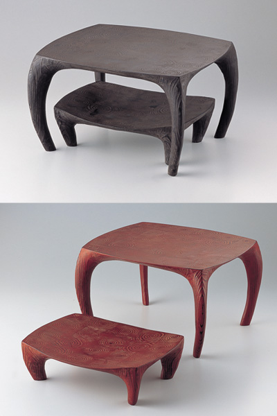 環境への配慮から、今、木工界では間伐材の有効利用が大きなテーマとなっている。その難しい素材をこれほど魅力的に生かしたクラフト製品を見たのは初めてであった。形そのものは素朴な李朝家具の特徴を継いだものであるが、木口がおもてに現れるように仕立てた表現力、そして、まるで一枚の布をまとっているかのように仕上げた技術力を駆使し、このようなスタイルにまでまとめ上げた仕事の充実度はすばらしい。