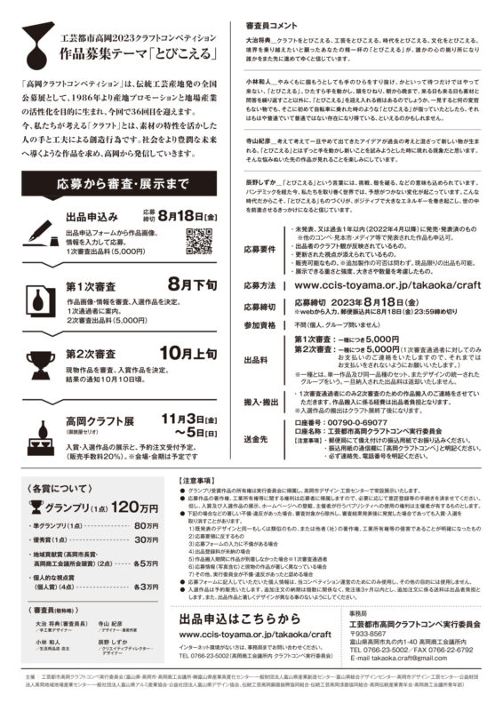 工芸都市高岡2023クラフトコンペティションの公募を開始 工芸都市高岡2023クラフトコンペティションの公募を開始しました。 応募につきましては、作品募集ページの応募フォームリンクよりお進みください。皆様のご応募をお待ちしております。 申込みは、ネットでのみ受付しております。