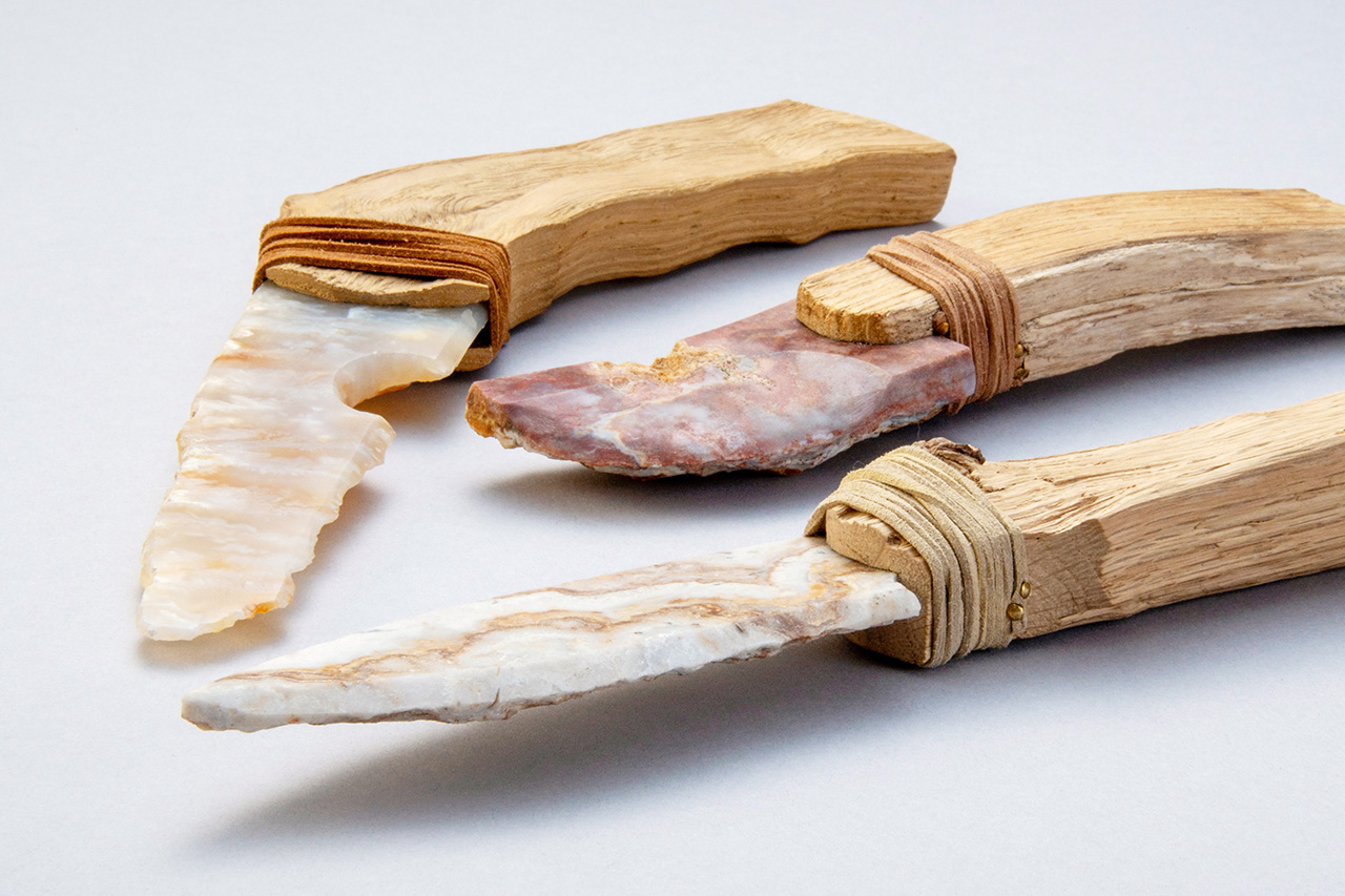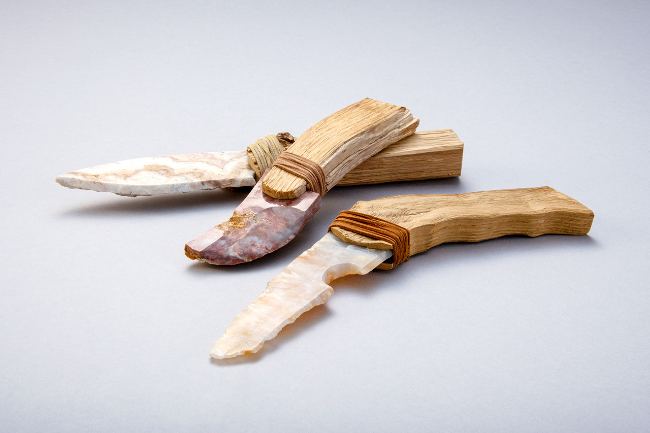 「クラフトとは何か」ということを問い直す出品作が目立った今回の選考会の中でも特に評価が分かれた作品の一つでした。道具としての実用性を疑問視する声もあった中、私は高岡クラフトコンペにおいては必ずしも機能性だけではなく、抽象性ともいえる「物が孕む余白」に目を向けた評価もあって然るべきではないかと考え、この護符のような存在に一票を投じました。刃は北海道瀬棚郡今金町花石で採れる瑪瑙の原石から加工。栗材のへぎ目や瑪瑙の剥離面からは荒々しい印象を受けつつも、刃と柄の峰のラインの繋がりと手に取った際のバランスに細やかな配慮が感じられます。刃と柄の合わせは、栗材を割って石の根元を挟む方法と、彫り込んだ穴に差し込む方法の2通り。接合部の固着には弾性に富む変性シリコンを使用との事ですが、個人的には多少不便でも松脂や鹿の腱を用いるなど、古代の技術で通して欲しいという気もします。なぜなら、無意識に響く作品の魅力というのは、もしかしたらそのような「手間」の積み重ねにより醸成されていくのではないかと考えるからです。