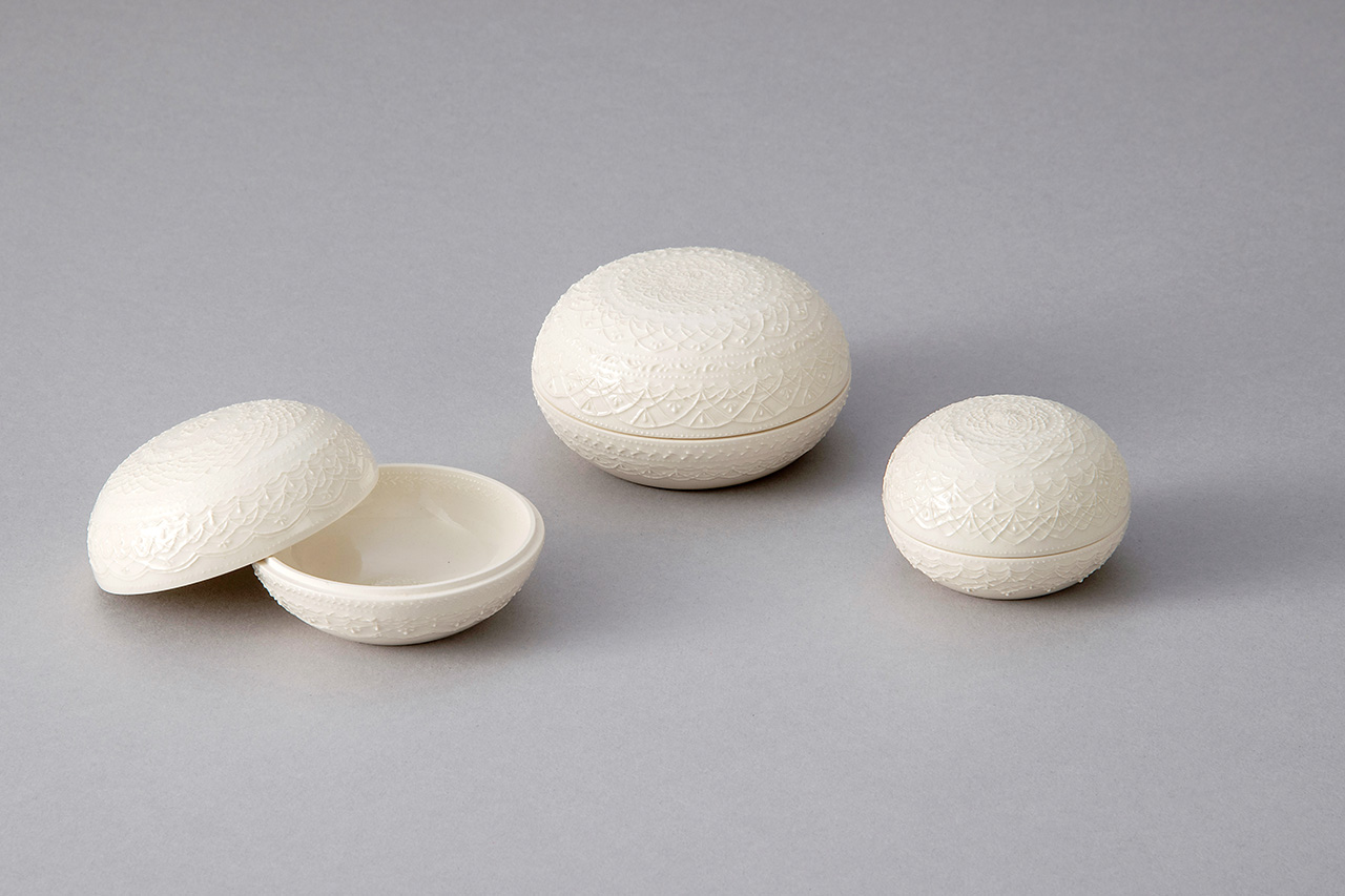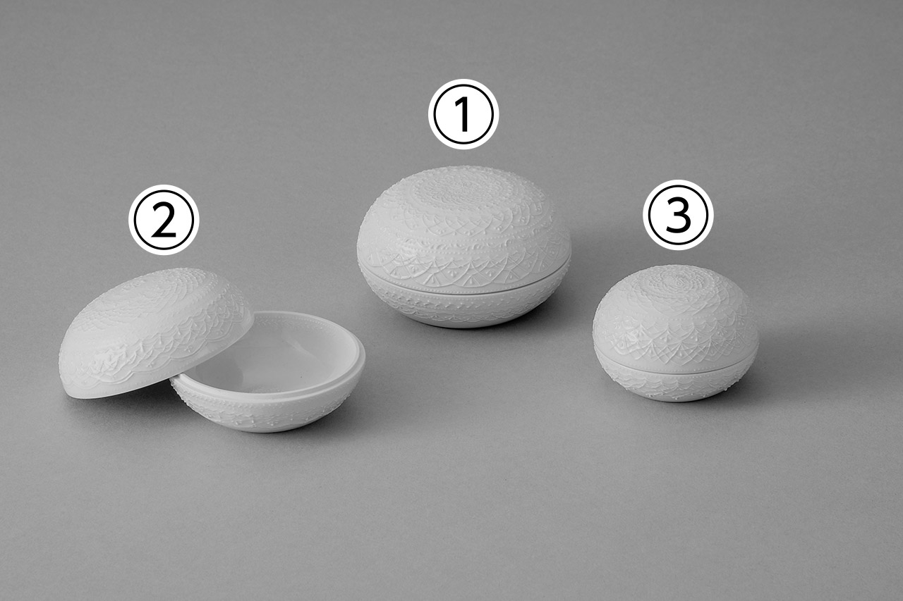 2021年 陶磁器 アクセサリーケース 磁器 ①大:9×9×5㎝、②中:8×8×5㎝、③小:5.5×5.5×4.5㎝ ①大:¥15,000、②中:¥13,000、③小:¥10,000 藤井 未央 フジイ ミオ 富山県 表示価格はすべて税込です。