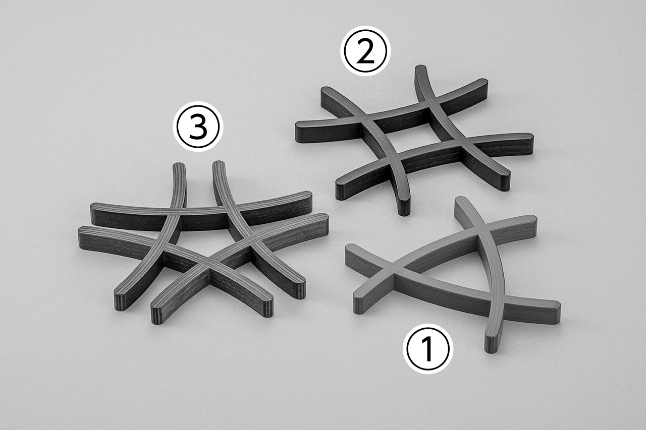 ①tri:17.8×15.5×1.6㎝、②tetra:17.8×17.8×1.6㎝、③penta:20×19×1.6㎝
