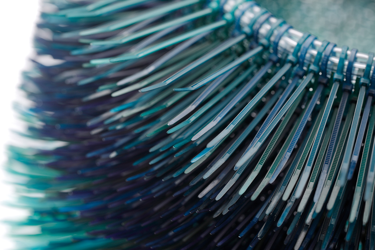 私は染めや編みといった染織の手法を使い、現代の素材に置き換えて作品を制作しています。普段見たことがある素材が一変し、全く違った素材へと変化します。具体的には、結束バンドをポリエステルを染める染料で圧力鍋を使って浸染します。そこで微妙なグラデーションを作ります。そして、結束バンドの「とめる」という機能を使って編み上げて立体にします。私が生まれた頃には身の回りに溢れるようにあり、自分が育ってきたうえで重要な素材にプラスチックがあります。プラスチックのニュートラルな不自然感に疑問を持ち、使い終わると捨てられ消費されていくコードをまとめ止めるなどの用途の結束バンドを素材として扱っています。大量生産され消耗される既製品は記憶に残りにくいです。しかし人の手に触れた瞬間そこに何らかの個性が現れます。意識していないと忘れ去られるちょっとした行為だからこそ、その小さなひとつひとつの「個」に化ける瞬間を留めたいと思うのです。今回の作品では湖に浮かぶ壺をイメージしています。湖に伝わる伝説(私が住む秋田県の田沢湖がある)、底面に映る水の色、また結束バンドを染めて編むといった行為が結びつき、一つの作品となればと考えて作りました。
