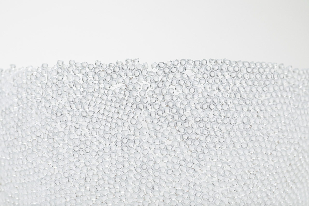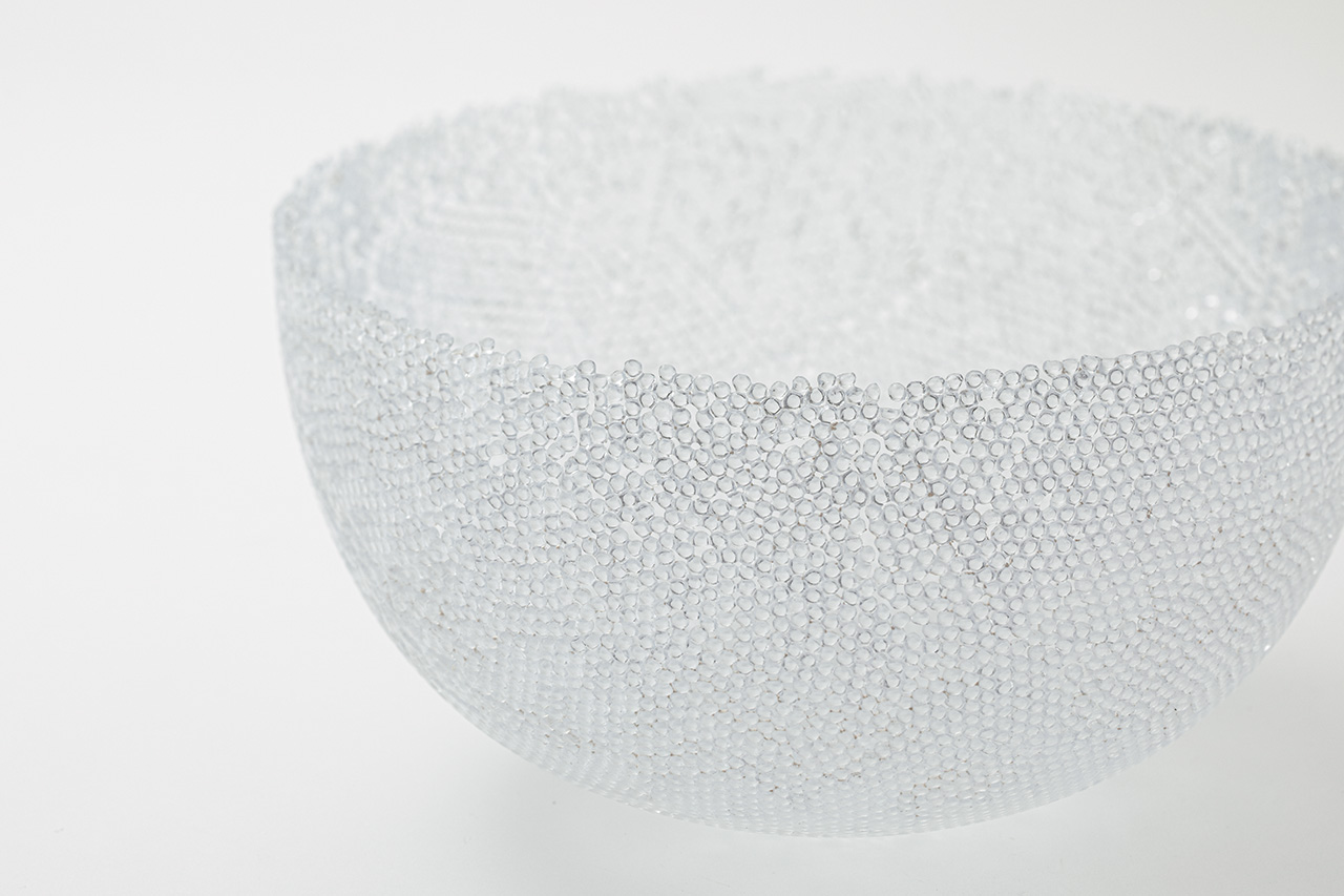ガラスの繊細さと透けることの美しさを十分に引き出した作品です。置いてある姿も魅力的ですが優しく持ち上げると自分の手の輪郭がぼんやりと浮かび上がりこの作品の良さがより伝わりました。小さなガラスビーズを並べ火にかけることでどこがどのように接着していくのかは自然に任せる制作工程もこの作品の魅力の一つになっています。難しいのでしょうが欲を言えばもっと大きなものが見たかったです。