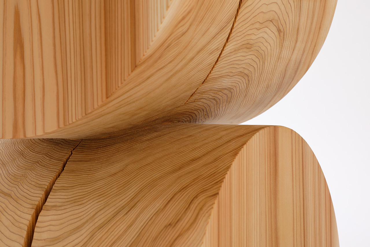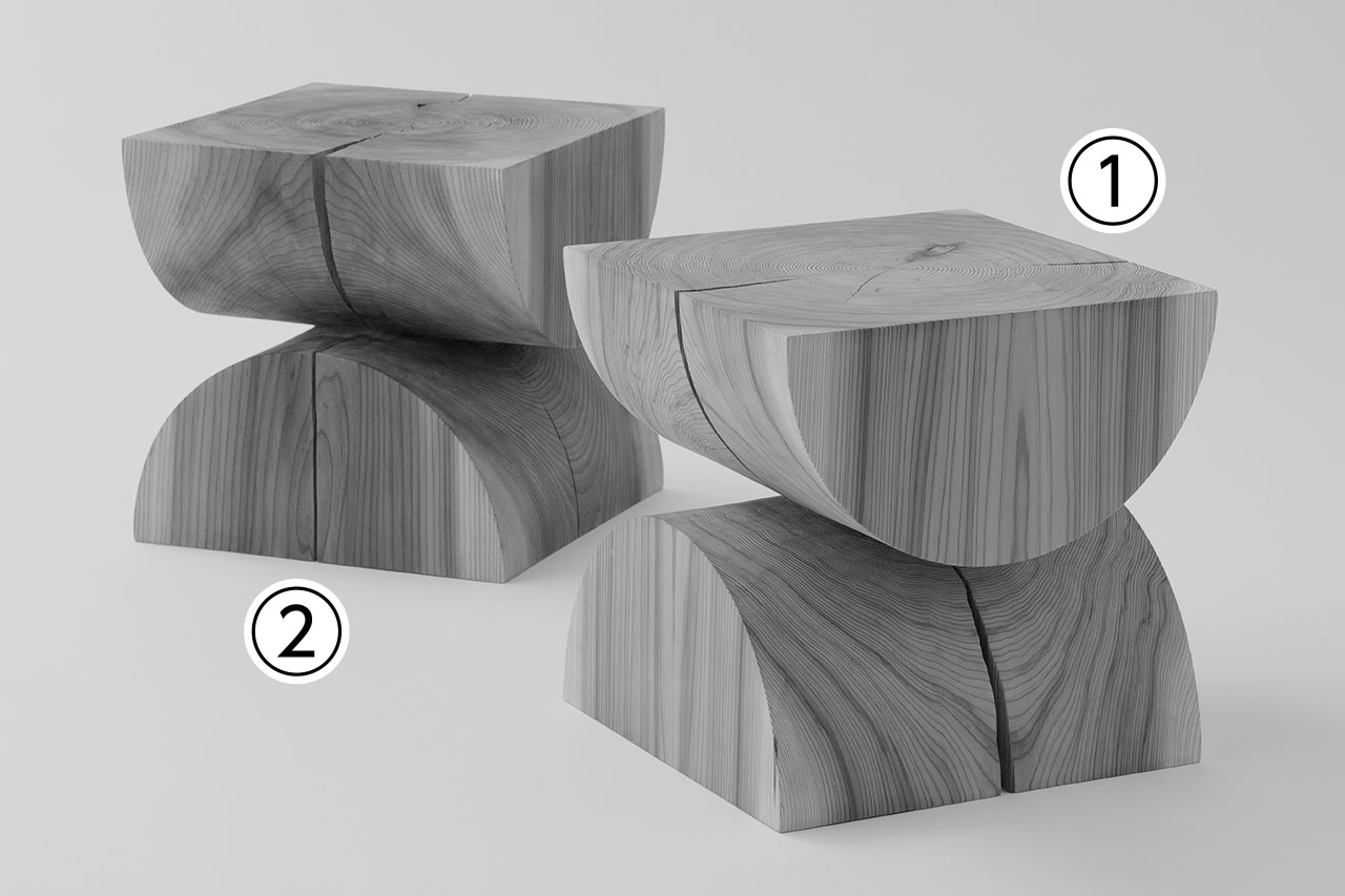 宮大工をしていた経験から、独自の方法で一つの立方体の木の塊から削り出した作品です。材料は国産材の杉を使っています。今回はナチュラル色と鉄染めの2色を用意しました。作品の用途は特に決めていないので、家具やオブジェクトなど人それぞれの使い方を見つけてもらいたいと思います。