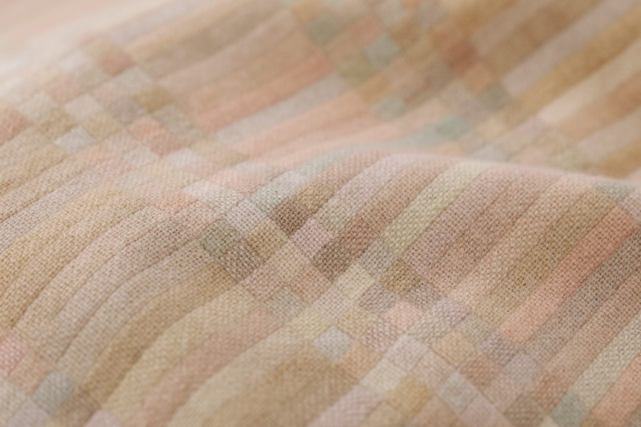 肌の色をモチーフに15色に染め分けたカシミヤ糸を二重織で織り上げました。この技法はタテ・ヨコの糸が交差して色が生まれるのに加え、上下二層の面が交わる事で新たな色が生まれます。カシミヤが発する温度感と様々な色が生み出す人肌のぬくもりを作品にまとわせました。