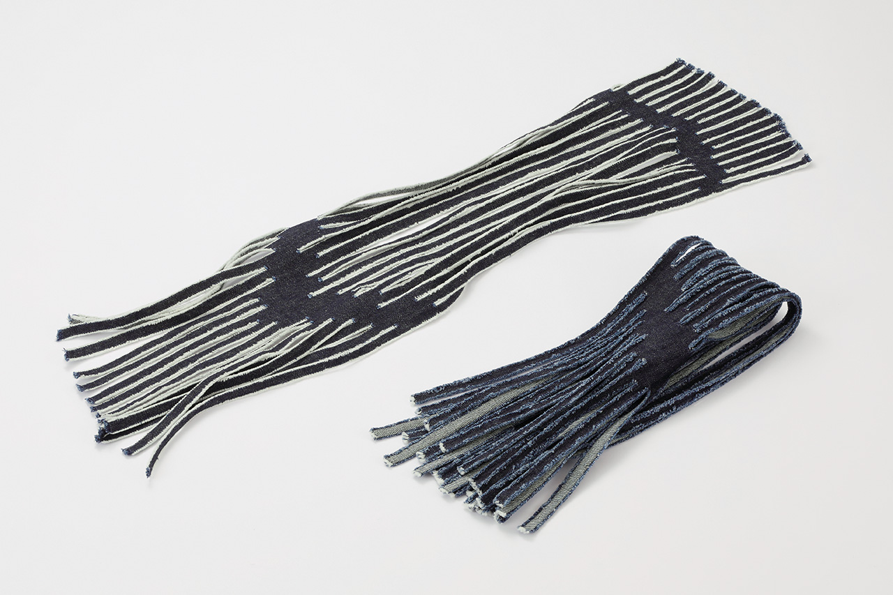 2022年 ジュエリー さざ波 デニム生地、糸 約73×20㎝ ①白・②青:各¥27,000 丸山 聡子 マルヤマ サトコ 岡山県 https://www.instagram.com/maruyamasatoko_yoki/ 表示価格はすべて税込です。