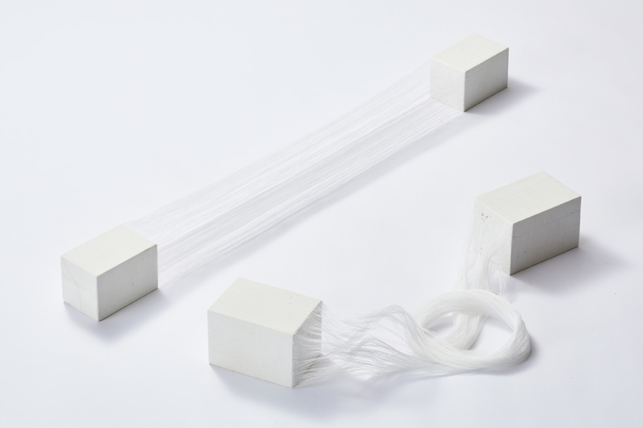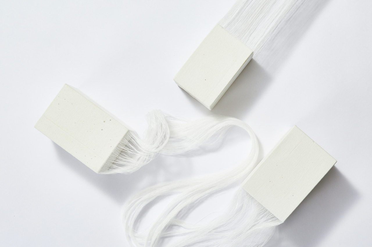 布という素材に対して、裁断や縫製といった作業とは違う介入の仕方を探っていたとき、ふと布の一方向の糸を引き抜く行為を続けてみた。長いスパンで糸を抜き続けると、織られる前の糸が並ぶだけの状態とは違う、行為による痕跡が現れた。この痕跡や形状の変化をあらゆる角度から眺められるようなオブジェを作成した。