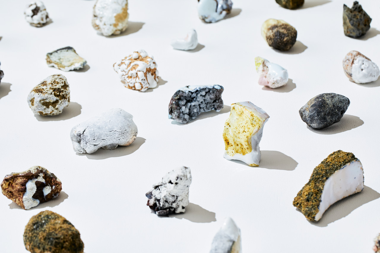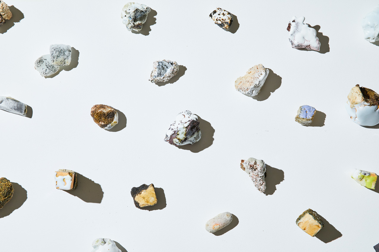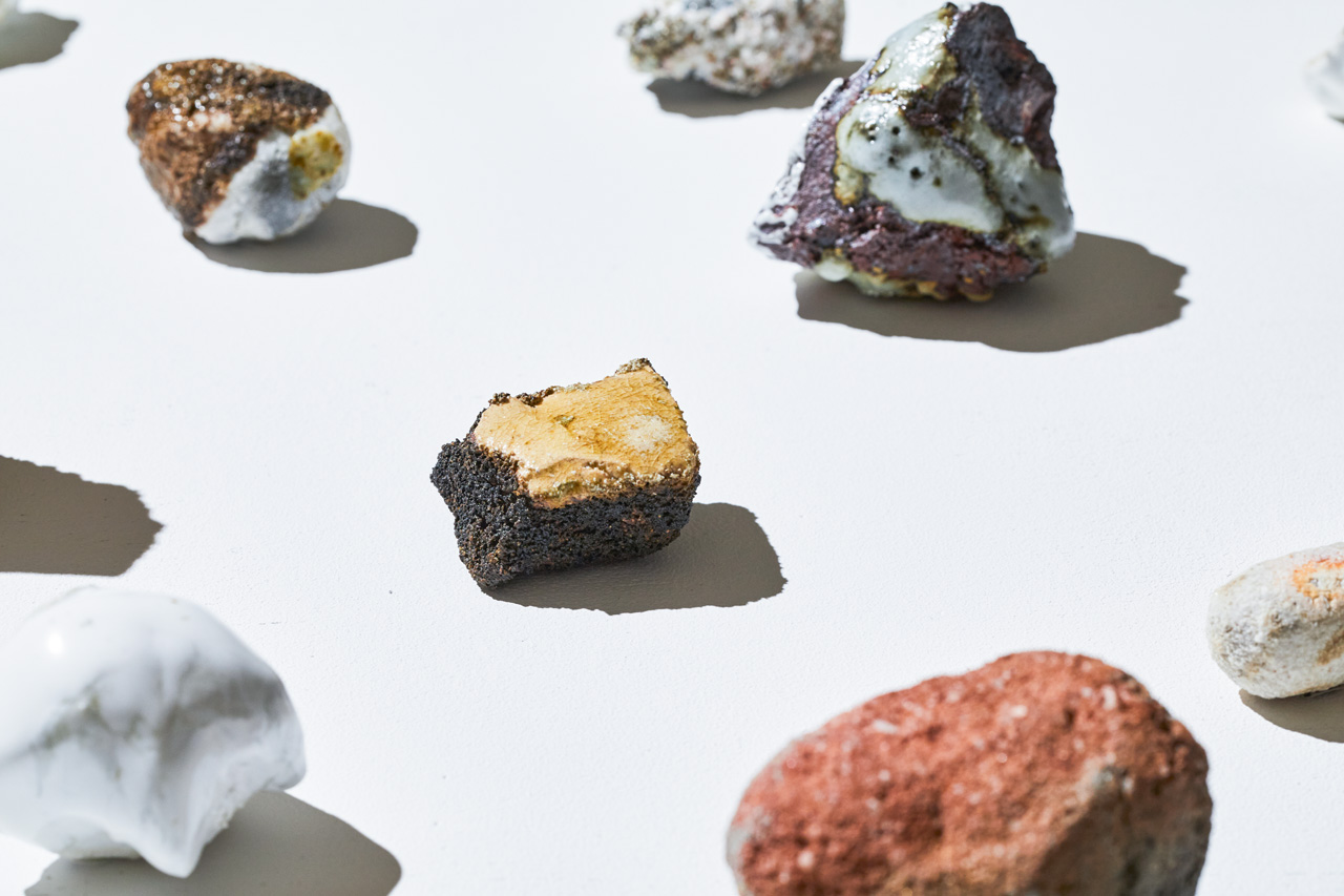 多くは、余った⼟や釉薬、試作として焼いたものなど、制作における副産物を素材としているとの事。⽇々の意識的な営みからこぼれ落ちた断⽚ともいえるそれらのの無意識性を損なわずに結晶化し、更に意識を巡らせて注意深く配置して差し出す、という「意識」と「無意識」が幾重にも複層する構造は、「クラフトとはなにか」を考える上での⼿掛かりになるかもしれません。
