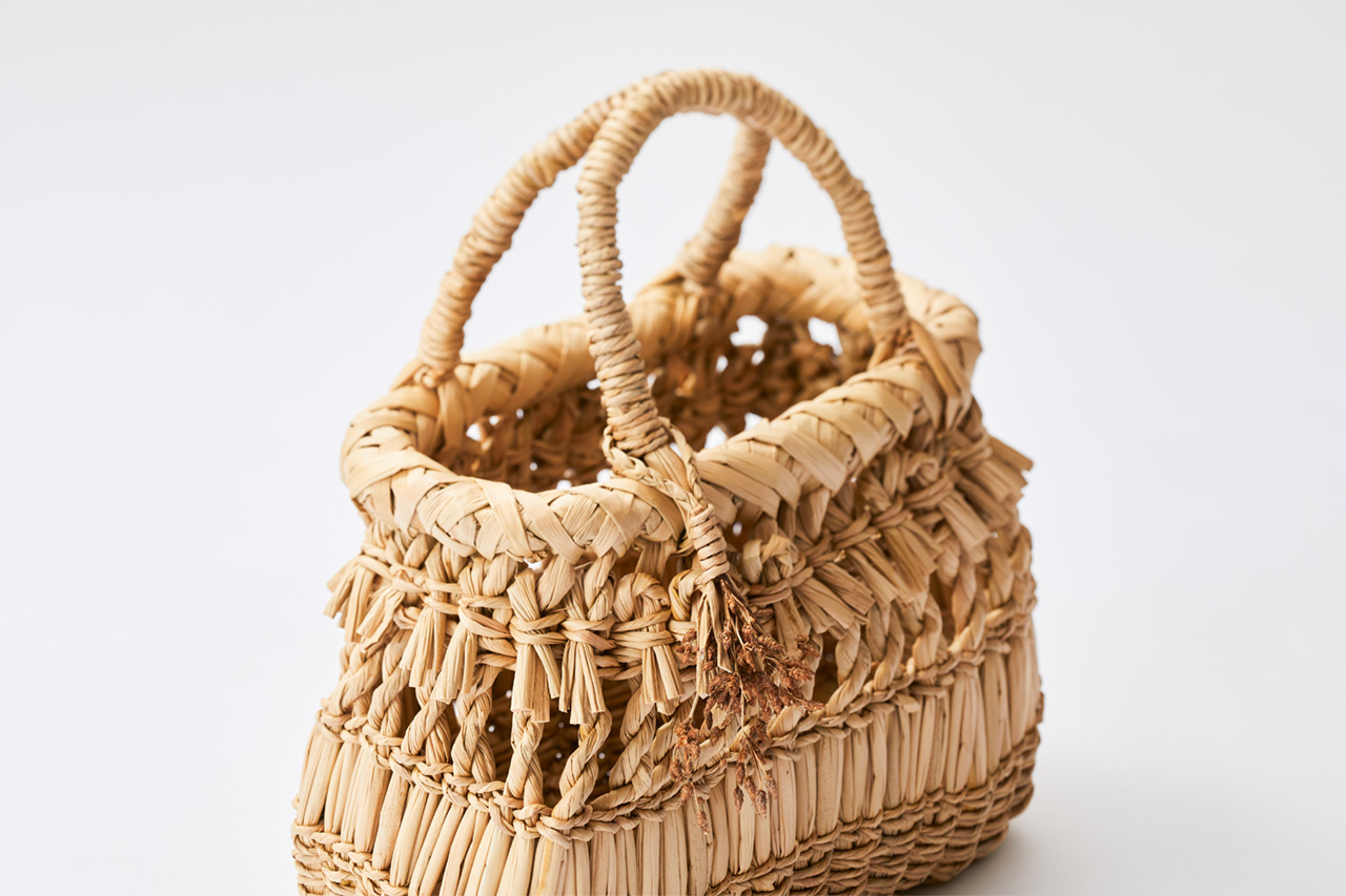 「オオフトイ」という草に魅せられ、⾃ら栽培を始め、その研究と普及活動に取り組む作者による本作は、⽇本の⼯芸では馴染みの薄い素材を⽤いながらも、どこか伝統的な⺠具を思わせます。道具としての完成度を⾼めようとすると、素材の⽣の魅⼒は薄れていく「ものづくりのジレンマ」があるなか、草である姿、縄に綯った状態、編まれて籠となった形、という三態が共存するこの着地は、素材への敬意と愛情の賜物ではないでしょうか。