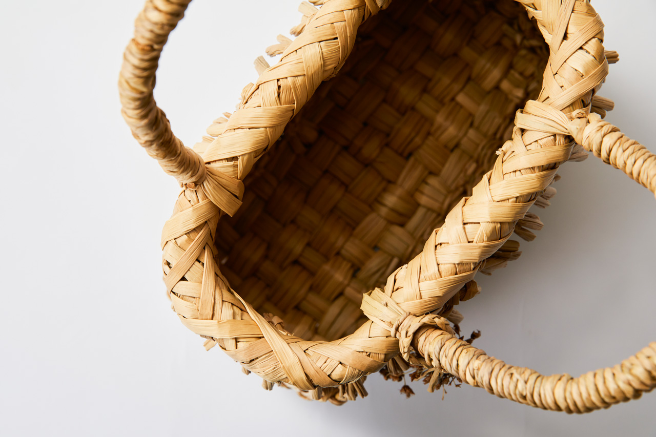 これは、草であると同時に籠である。乾燥を経たオオフトイの束の中から一本一本引き抜いて、その手触りや匂いなどを感じながら籠に編む。できる限りオオフトイの特性を生かし、草である姿を失わないように。その試行錯誤の中でたどり着いたのが、縄に綯うことであった。立ち現れた縄文はデザインとしてではなく籠になる必然の形である。初めて縄を綯った縄文の人はどんなに嬉しかったであろうと、自分の得た喜びから想像する。更なるリスペクトとして竪穴式住居を思わせる端処理をし、穂のチャームには籠を持ち歩く人がオオフトイの種と文化を蒔き広げる思いを込めて、このオオフトイは草のまま籠になった。