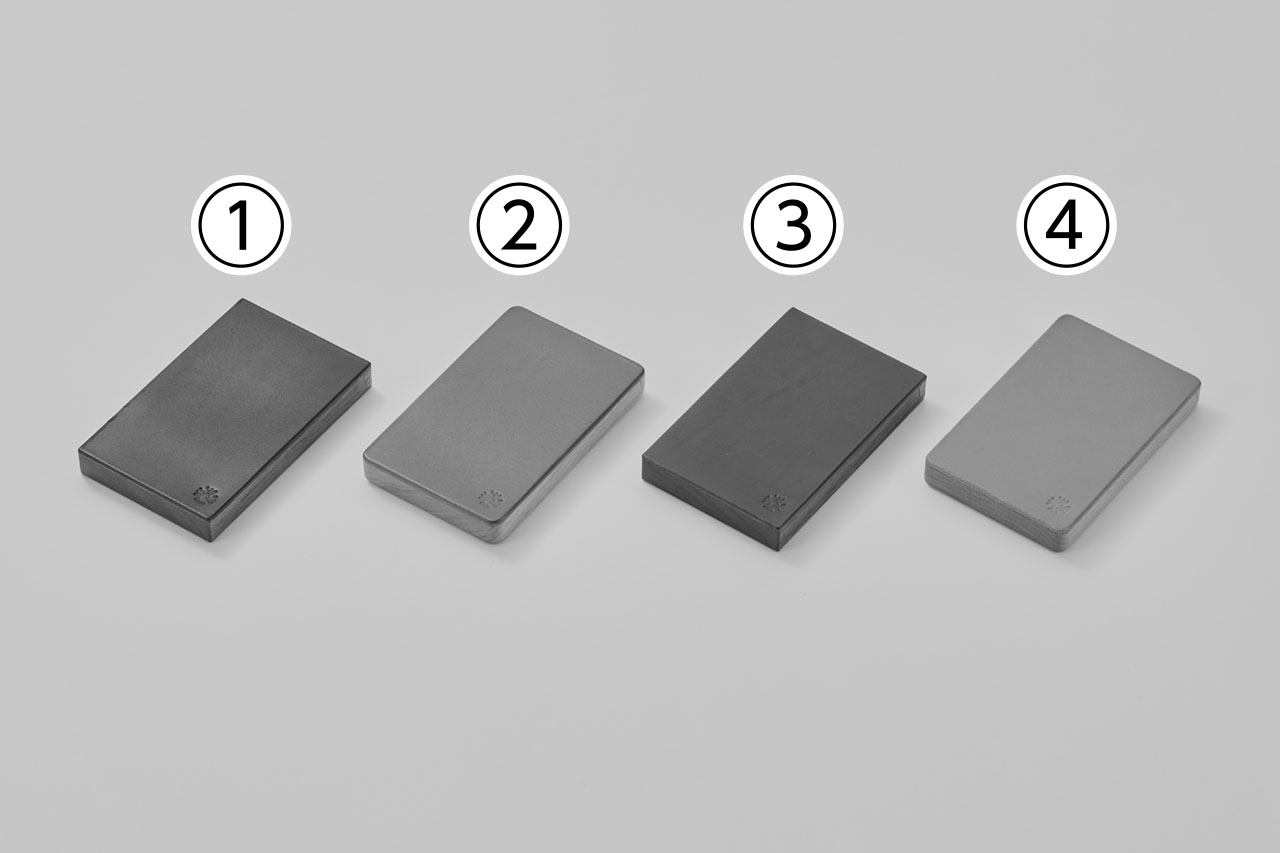 ①sharp Black・②rounded Red・③sharp Blue・④rounded Camel:各¥15400