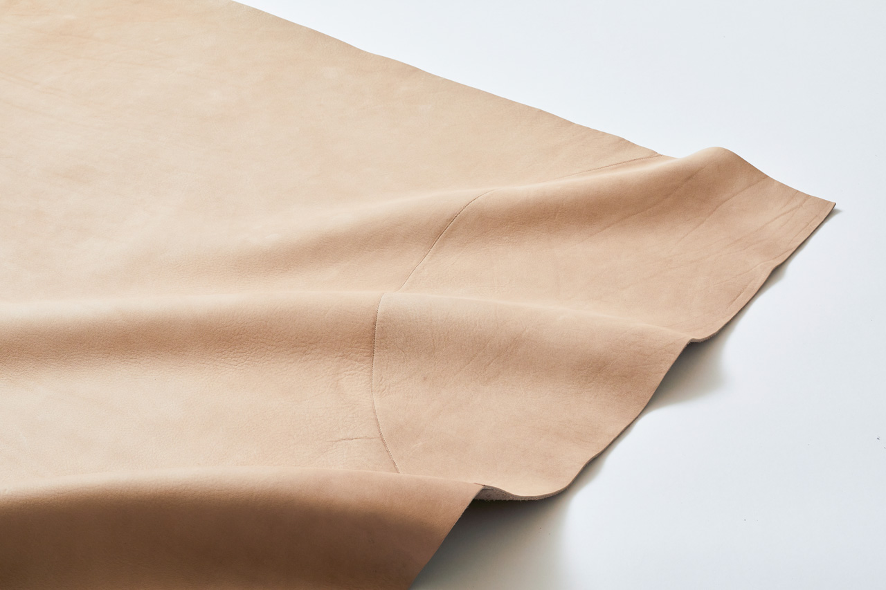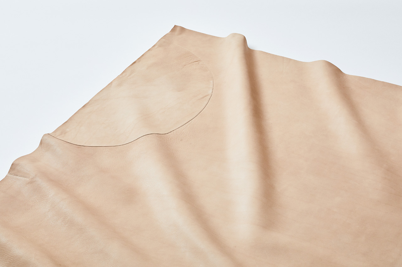 建築と家具の間のような存在を目指した敷物。牛の皮を選定し、鞣す工程からデザインを行なった。経年変化を楽しめる素仕上げとし、動物が本来持つシワや膨らみなどの痕跡は残した。一頭分の丸革を、少しオーバーラインした矩形で整え、くびれた部分は、自らの端材で埋め合わせる。個体差による意図しない模様が、美しい抽象画のように現れる。自然の循環からいただいた革と、それを使う人とが、共に長く時を刻んでいくことを考えた。