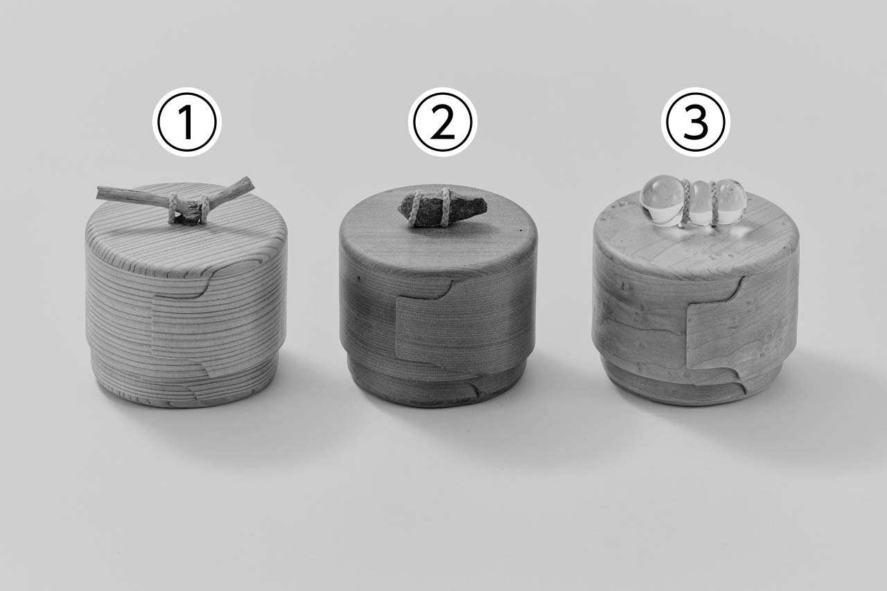 2025年 木工 まげきの小箱 小物入れ 杉、桂、メープル、枝、石、ガラス、ペーパーコード φ9.5×9.5㎝ ①枝・②石・③ガラス:各¥12,000 3点セット:¥35,000 高橋 未帆 タカハシ ミホ 茨城県 表示価格はすべて税込です。