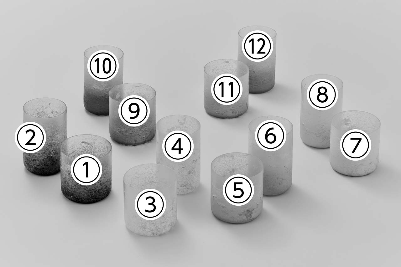 ①・③・⑤・⑦・⑨・⑪:φ8×8㎝、②・④・⑥・⑧・⑩・⑫:φ7×11㎝
