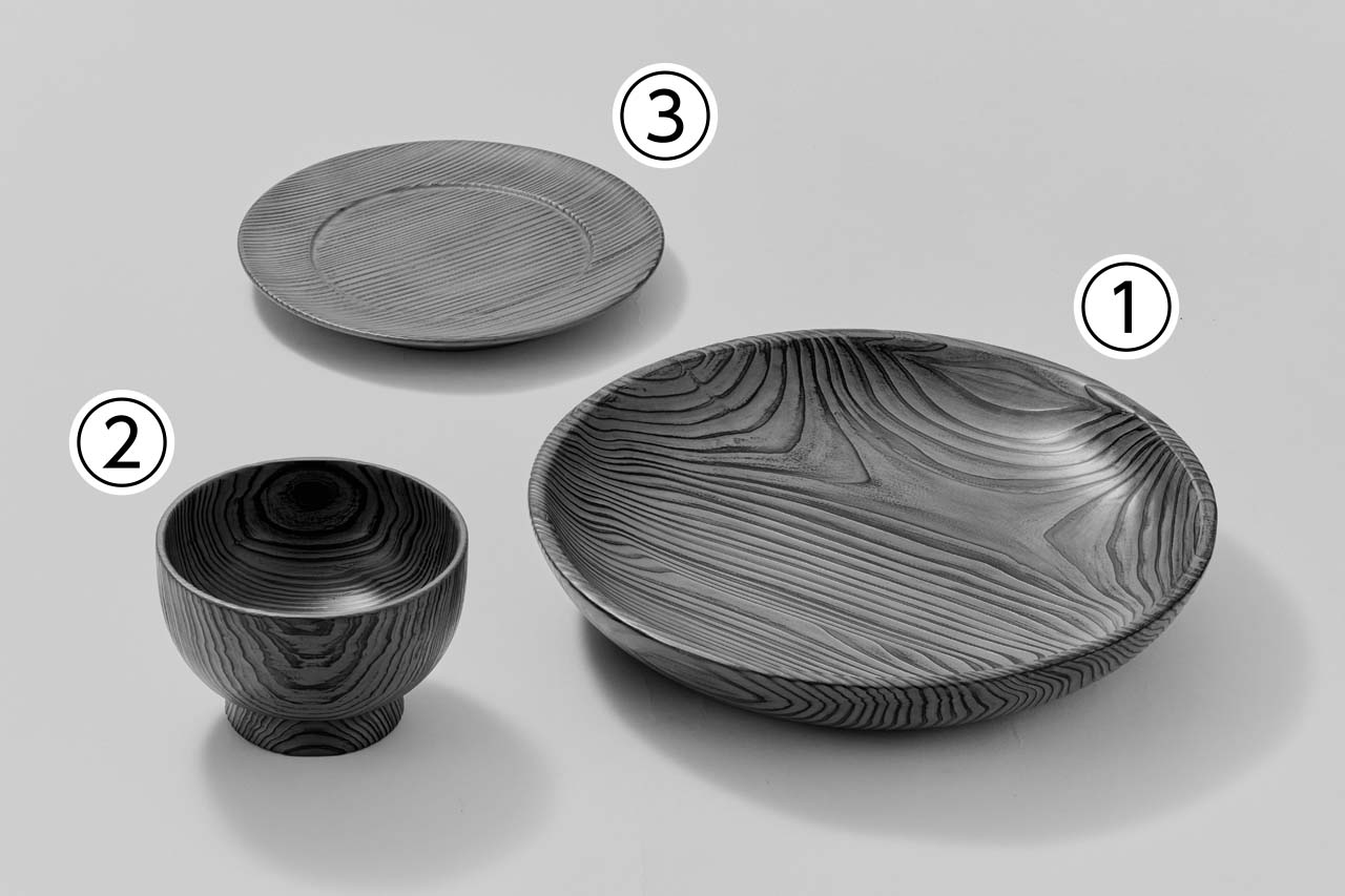 ①大皿:¥22,000、②椀:¥16,500、③リム皿:¥7,700