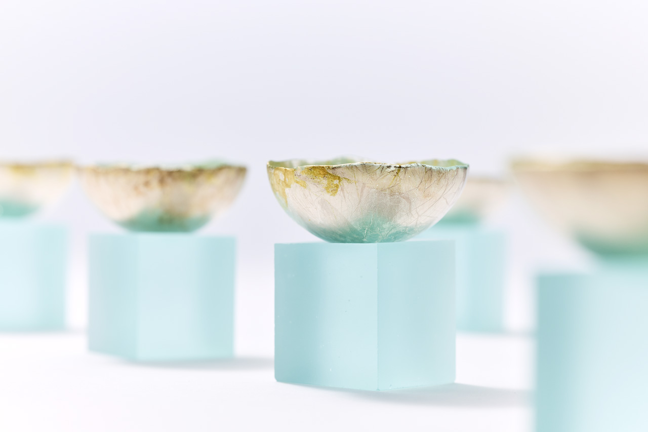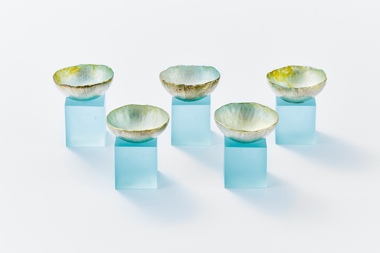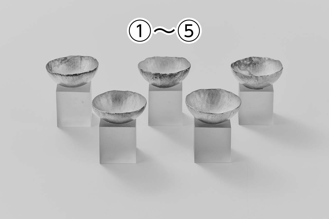 薄青の水面から月が現れたような幻想的な酒器になっています。「珪砂組」というガラスや金属などの素材で複合技術による表現を模索し京都を中心に活動するユニットの作品です。コアガラス技法によるバーナーワークで薄く軽い作品に成型し、金箔と銀箔で表面を仕上げているため金属の表面でありながら軽さを生かした作品が素晴らしいと思いました。