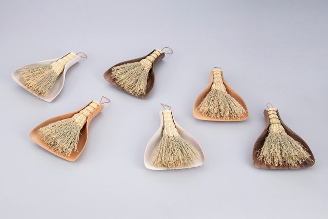 ウォールナット、ブナ(白い塗装)、ブナ、国産ホウキモロコシ、革紐、麻糸、天然ワックス
