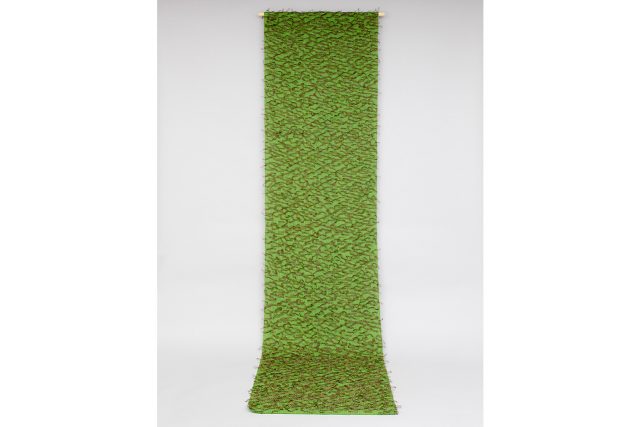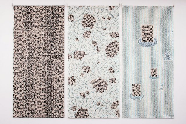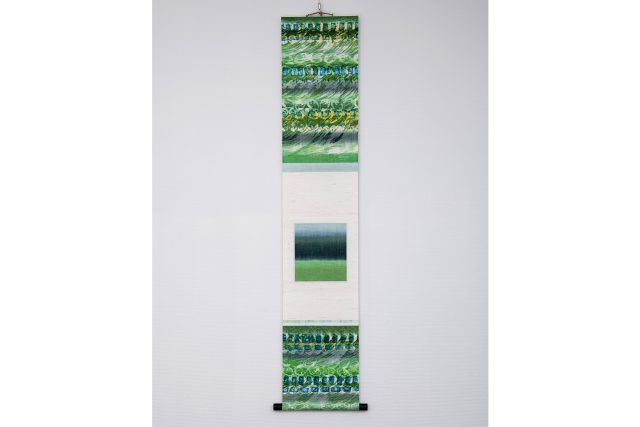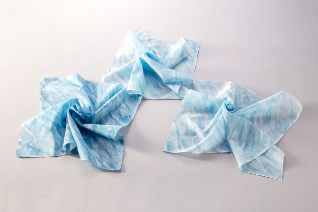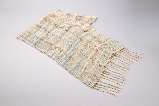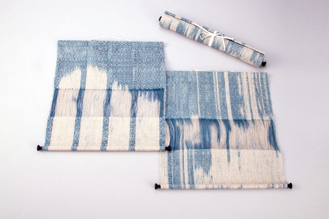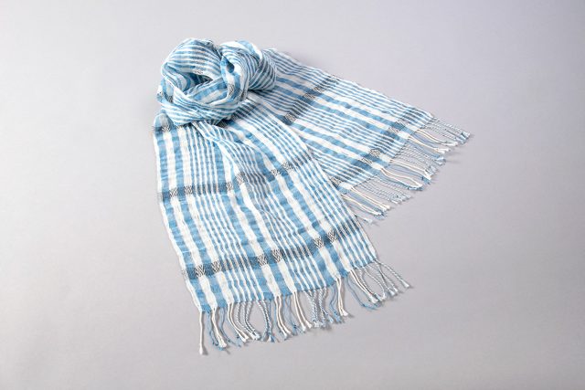 麻糸60/1(青)、カシミヤコットン75/3(白)、麻糸20/2(紺、緯糸のみ)