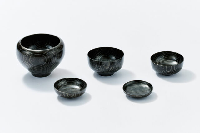 銚子:木製(栃材)、本漆、アワビ貝 カップ:木製(栃材)、本漆、アワビ貝