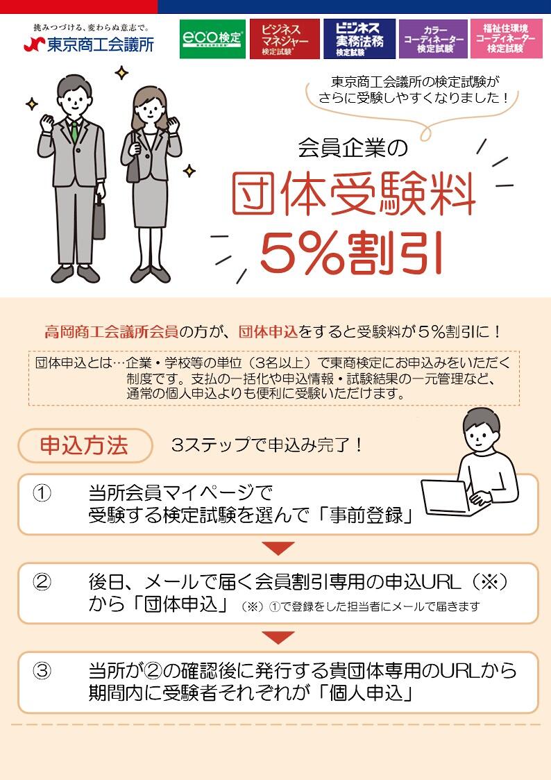 東商検定の「団体申込」ご利用の際、当会議所の会員事業所は受験料を5%割引にすることができます。