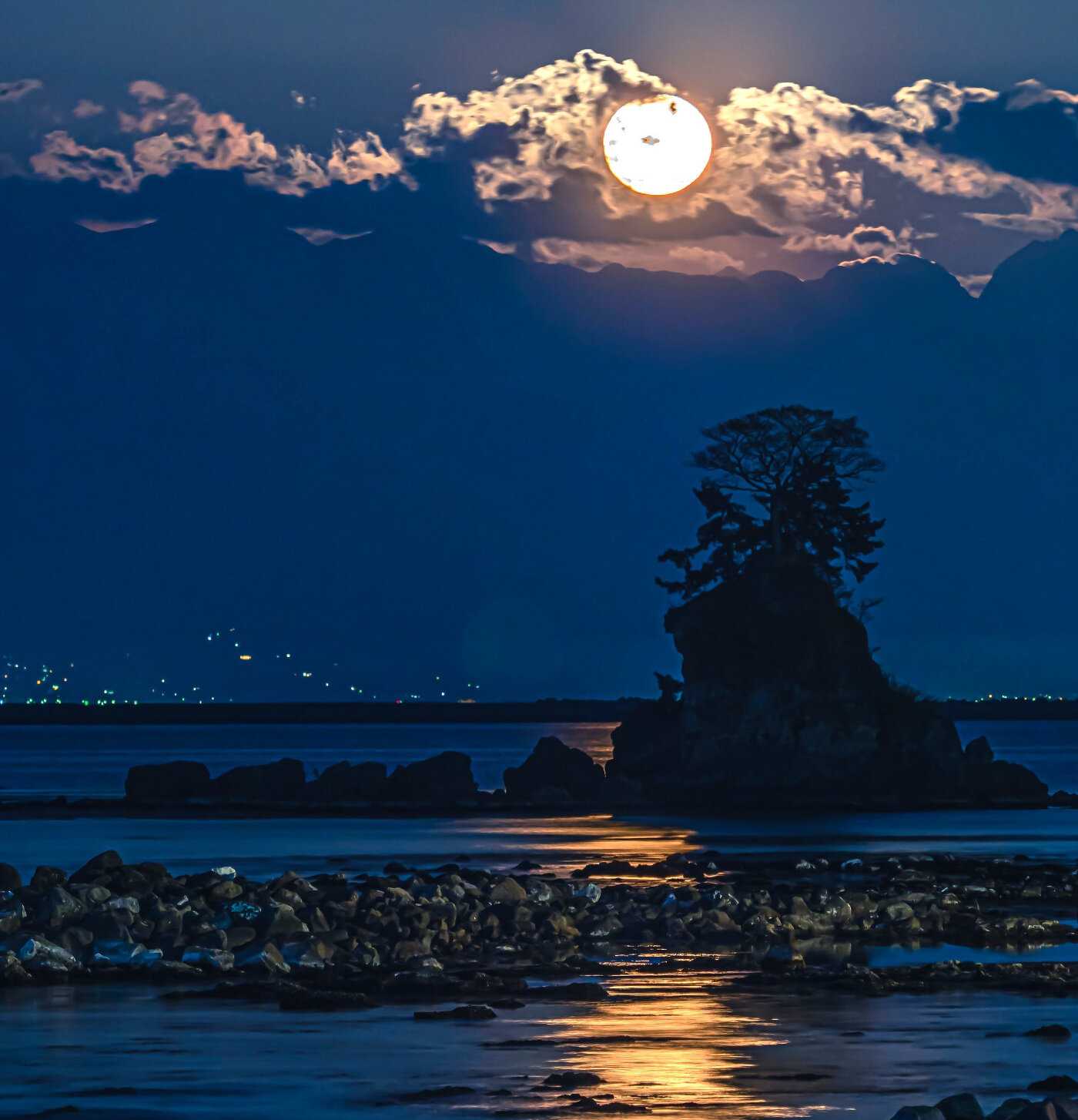 ○アメリカ先住民の間では、4月の満月をピンクムーンと呼ぶそうです。ピンクムーンのイメージにはほど遠いのですが、女岩から伸びる月の光を表現出来たらいいなと思い撮影しました。