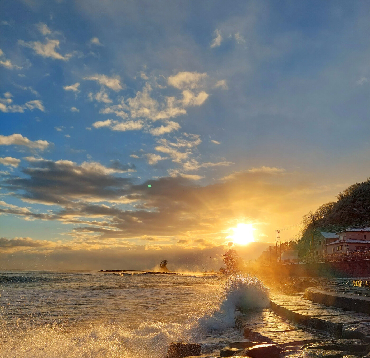 ○夜明け前からスタンバイし、日の出と高波、気嵐のセットがうまく撮れたものです。