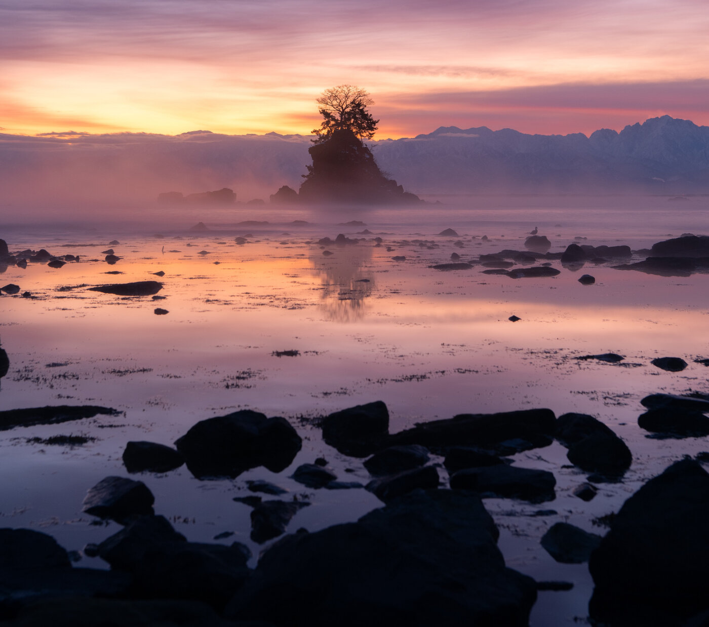 ○珍しい紫色の朝焼けも奇跡的に重なって、気嵐や水面まで幻想的な色に染まってくれました。ただ撮影はその幻想的な部分だけにならないように、シャープで特徴的な岩を前景に配置して対比できるように意識しています。