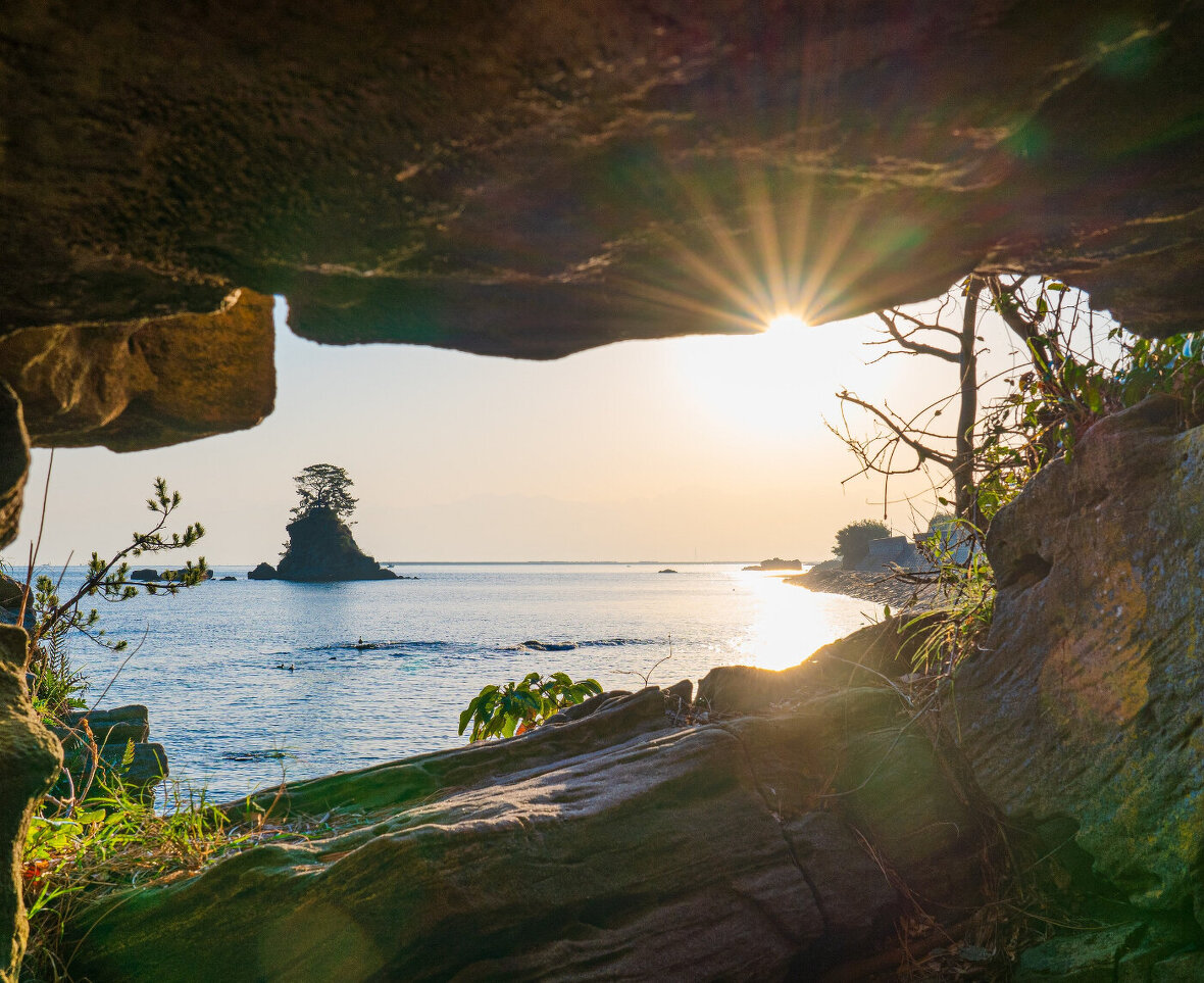 ○弁慶が岩を持ち上げ雨宿りをしたという伝説が残る「義経岩」から、「義経の視点で雨晴の風景を望む」というイメージで撮影しました。