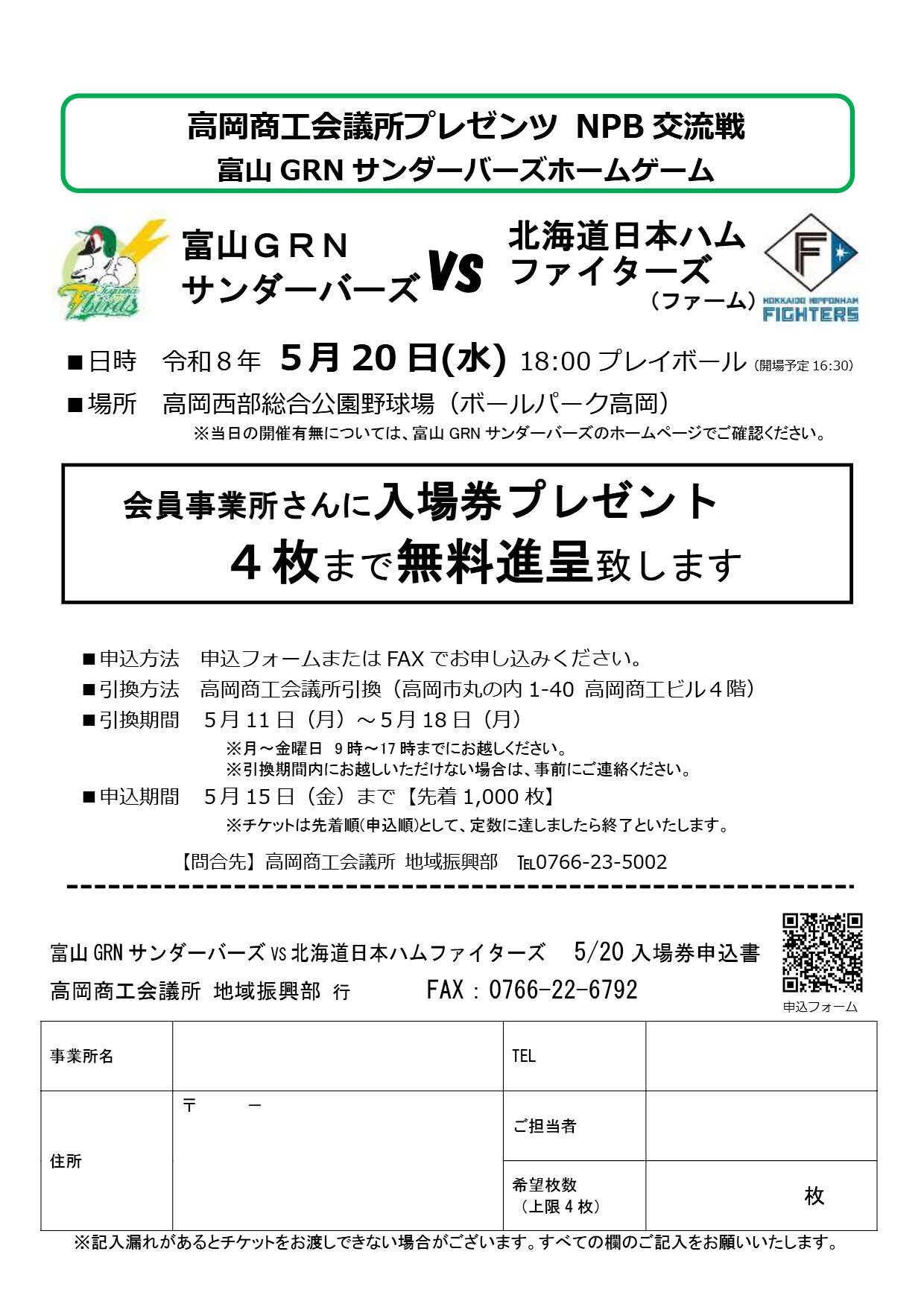 【5/20開催】高岡商工会議所プレゼンツ 富山GRNサンダーバーズVS日本ハム戦